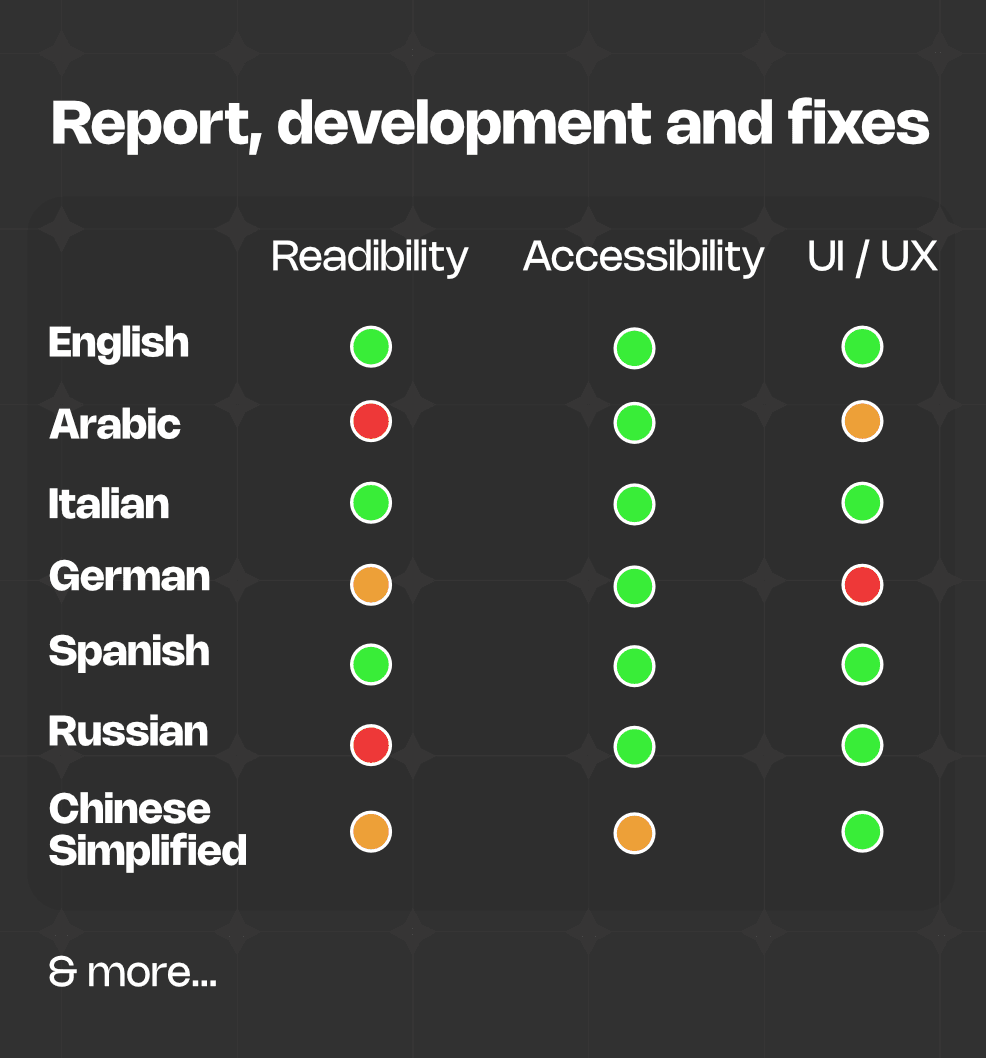 Once the systems are in place, we build testing frameworks so your team can verify localization without manually checking every screen in every language. Automated overflow detection, missing string reports and screenshot comparison pipelines mean you catch problems before your players do.