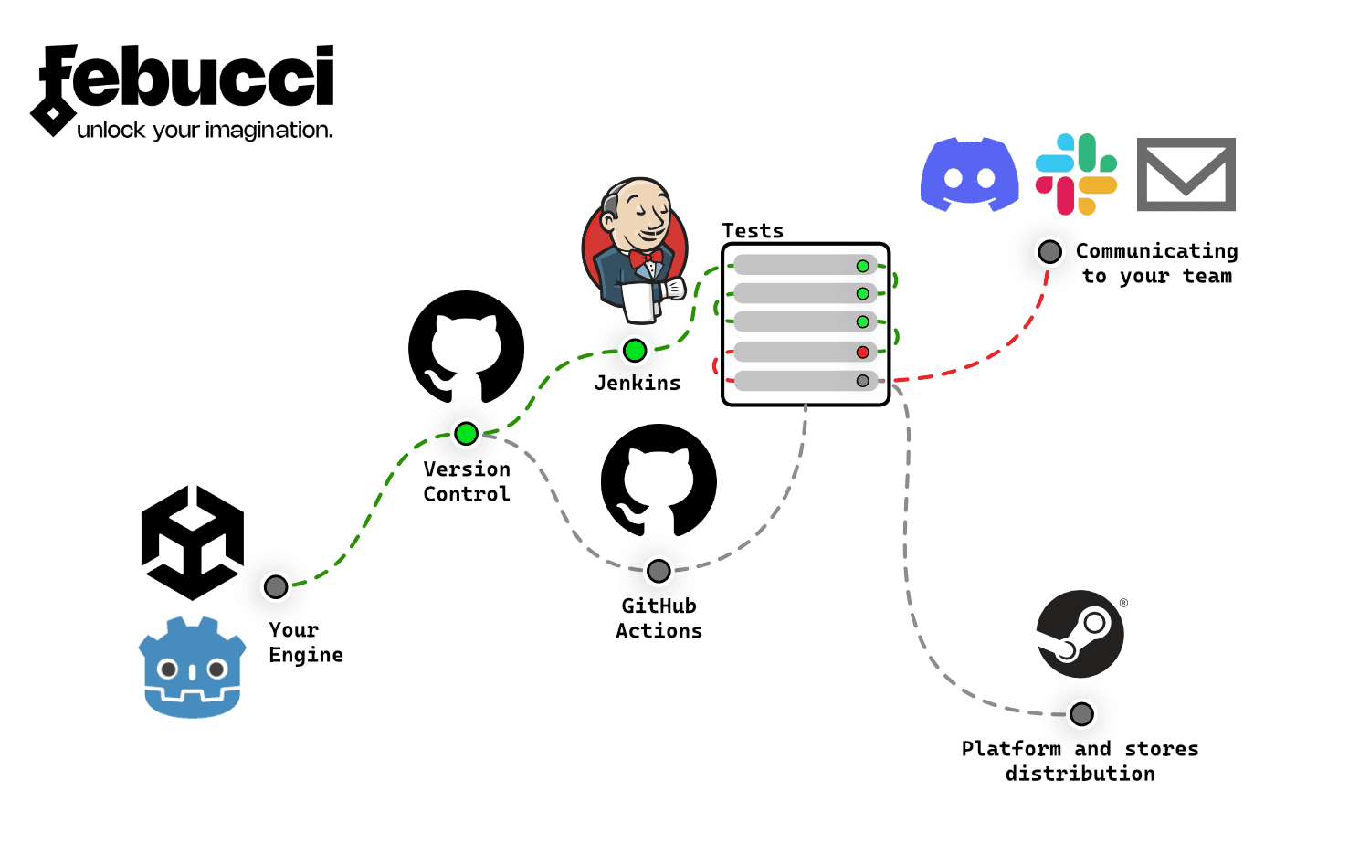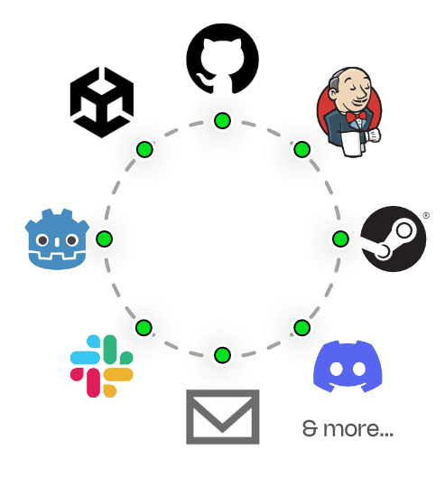 Build automation and distribution. One-click builds for every platform. Automatic versioning. Distribution to Steam, itch.io or internal testing channels.